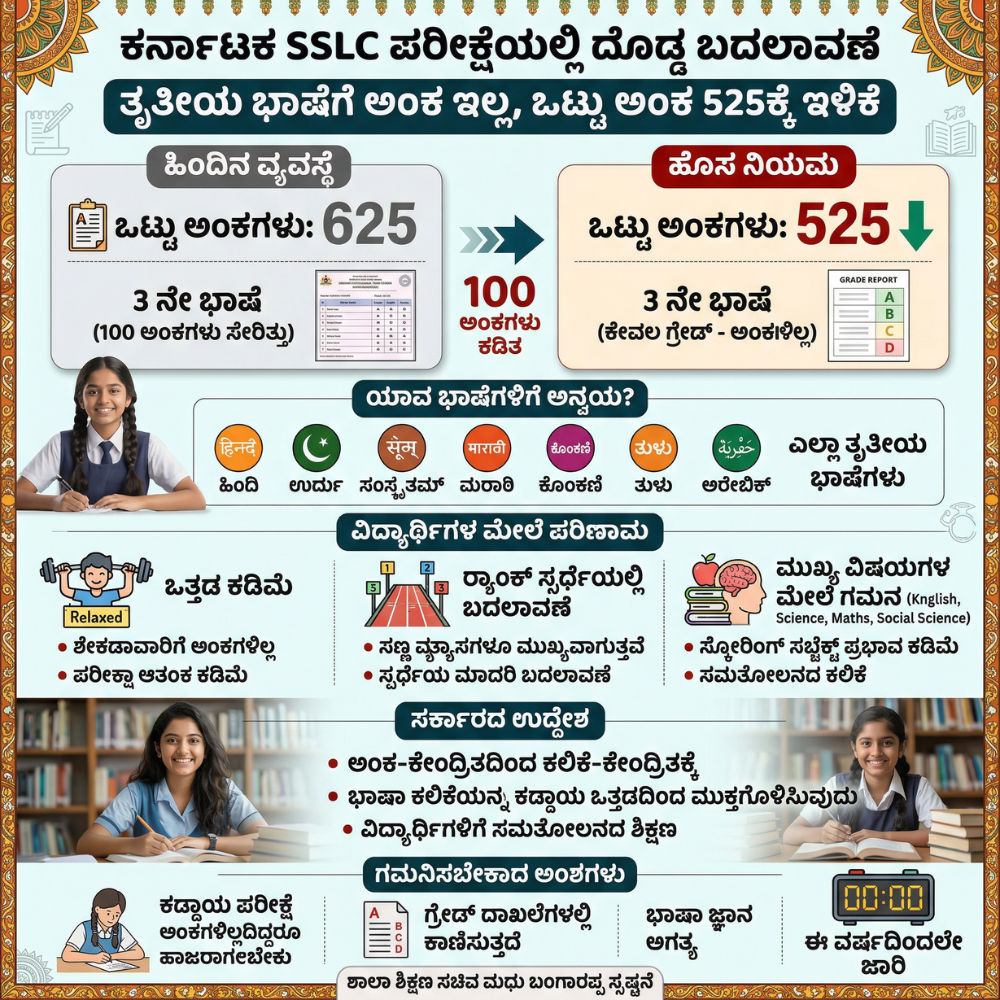 SSLC ಪರೀಕ್ಷೆಯಲ್ಲಿ ದೊಡ್ಡ ಬದಲಾವಣೆ: ತೃತೀಯ ಭಾಷೆಗೆ ಅಂಕ ಇಲ್ಲ, ಒಟ್ಟು ಅಂಕ 525ಕ್ಕೆ ಇಳಿಕೆ – ವಿದ್ಯಾರ್ಥಿಗಳ ಮೇಲೆ ಏನು ಪರಿಣಾಮ?